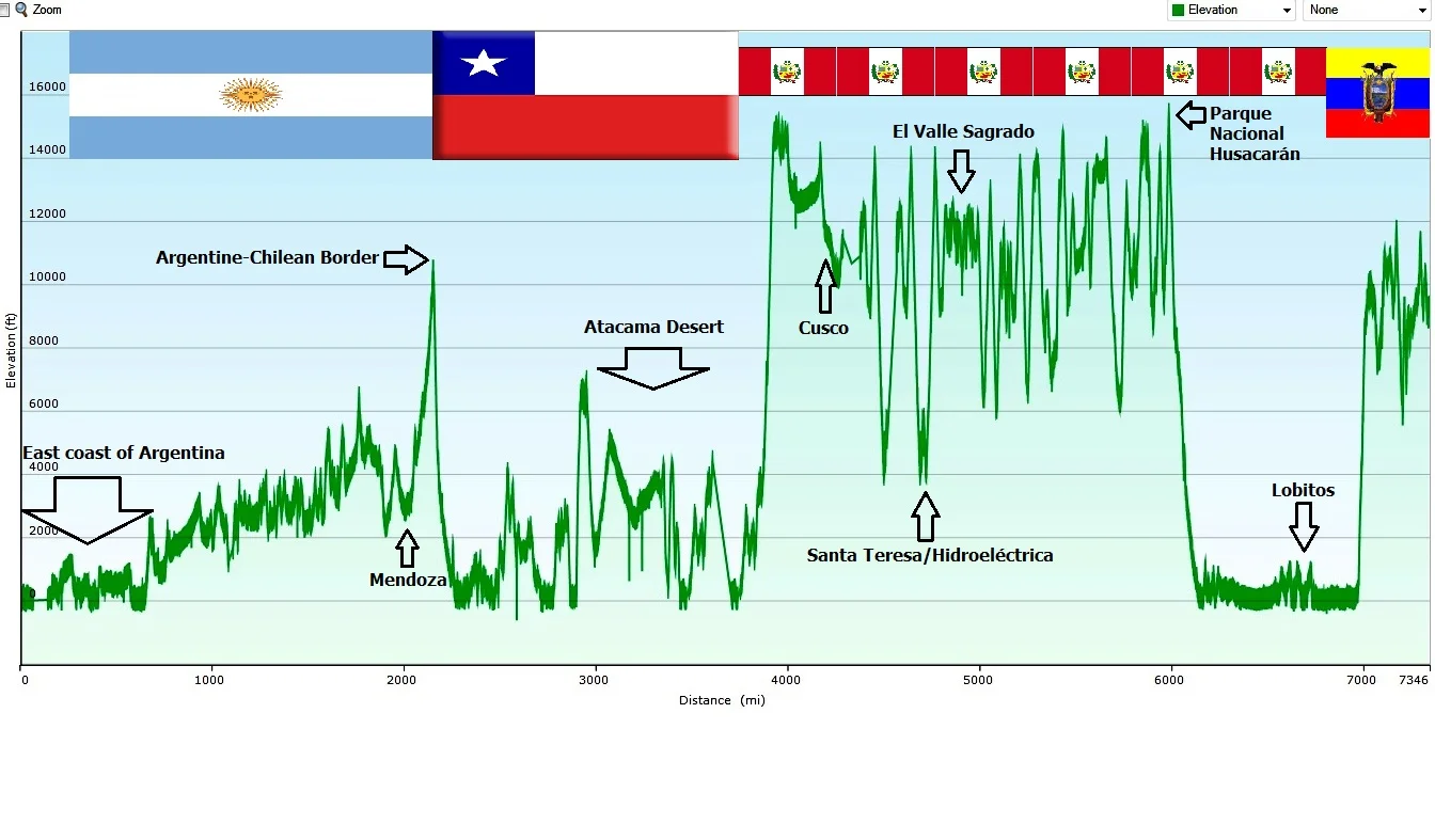 Finally, here's a consolidated map of all the terrain covered between Punta Arenas, at the southern tip of the continent, and Quito, near the northern end of the continent and at the center of the world. Think of it like a mathematical map of South America.
